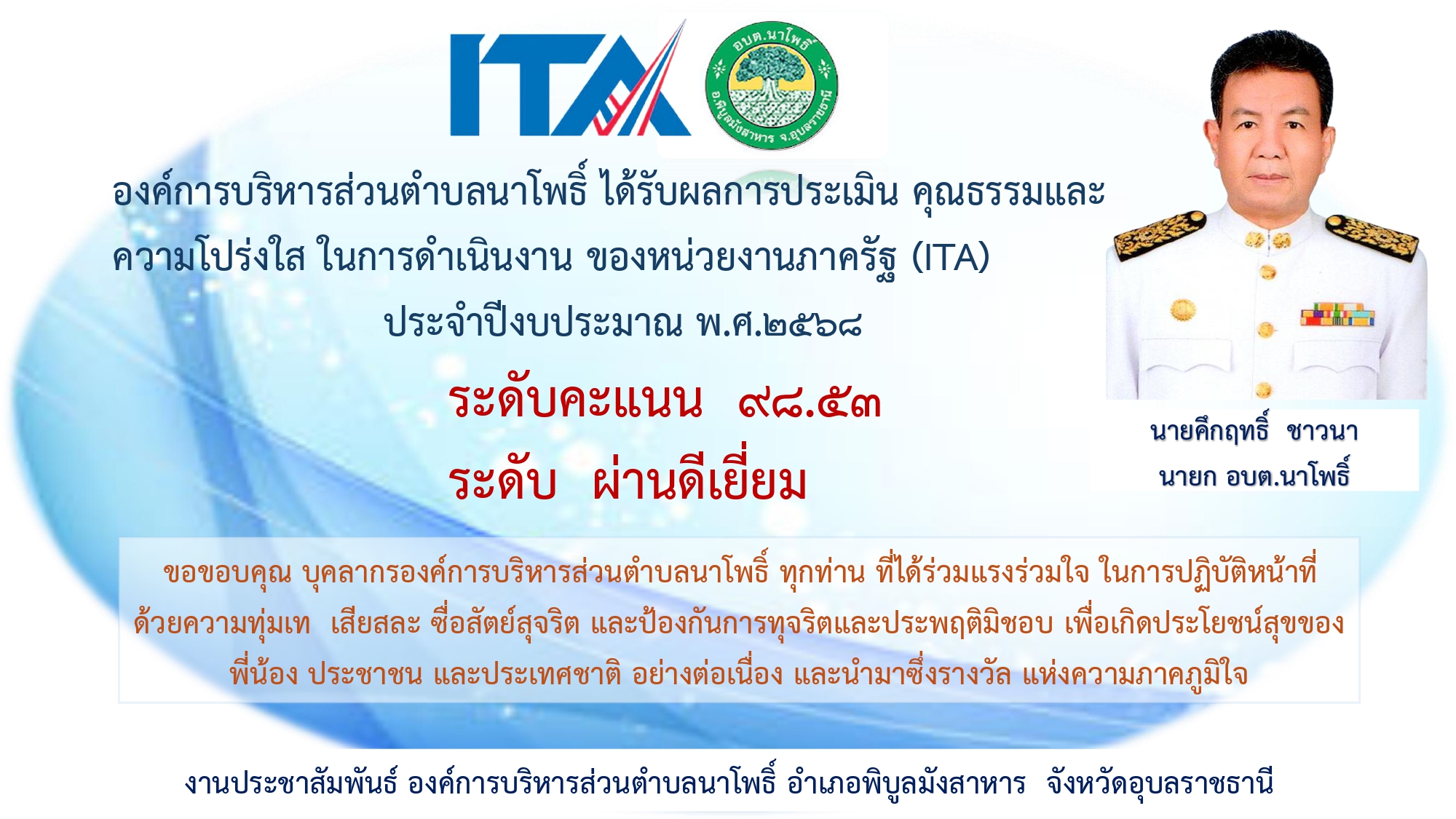 วันอังคาร, 19 สิงหาคม 2568 00:00องค์การบริหารส่วนตำบลนาโพธิ์ โดยนายคึกฤทธิ์ ชาวนา นายกองค์การบริหารส่วนตำบลนาโพธิ์ ได้รับการประเมินคุณธรรมและความโปร่งใสในการดำเนินงานของหน่วยงานภาครัฐ (Integrity and Transparency Assessment : ITA) ประจำปีงบประมาณ พ.ศ.2568 ระดับคะแนน 98.53 ระดับ ผ่านดีเยี่ยม ขอขอบคุณบุคลากรองค์การบริหารส่วนตำบลนาโพธิ์ที่ท่าน ได้ร่วมแรงร่วมใจ ในการปฏิบัติหน้าที่ ด้วยความทุ่มเท เสียสละ ซื่อสัตย์ สุจริต และป้องกันการทุจริตและประพฤติมิชอบเพื่อเกิดประโยชน์สุขของพี่น้องประชาชน และประเทศชาติ อย่างยั่งยืนและนำมา ซึ่งรางวัลแห่งความภาคภูมิใจ